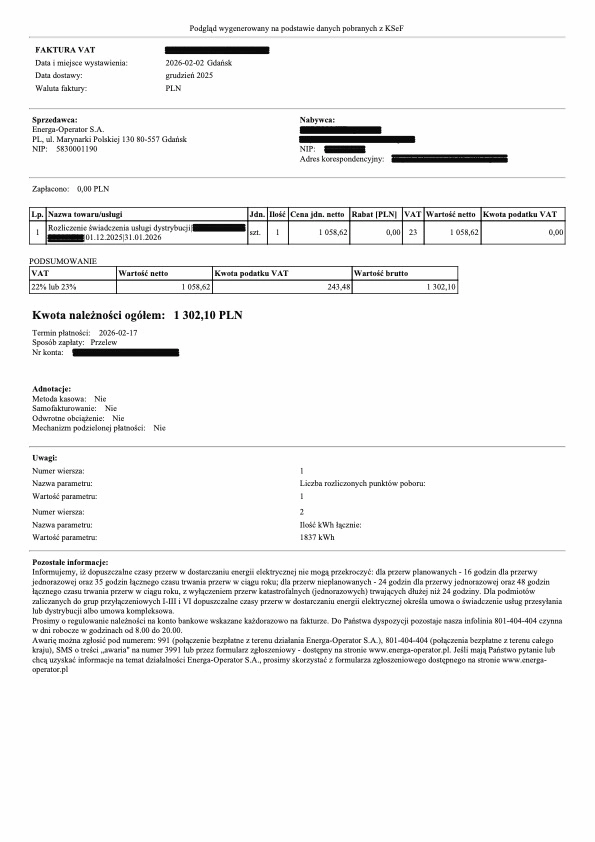 Widzimy to szczególnie na przykładzie faktur Energa Operator, gdzie obraz faktury przesyłanej mailem (PDF) znacząco różni się od tego, co klient jest w stanie podejrzeć po pobraniu dokumentu z KSeF. Podobne wyzwania pojawiają się także na obszarach działania innych operatorów – brak czytelnego rozbicia pozycji powoduje, że przedsiębiorcy nie wiedzą, czy płacą za energię bierną, przekroczenia mocy umownej, czy inne elementy taryfy.